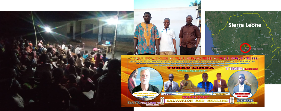 From March 16-18, IPICM worked directly with Musa, Emmanuel, and Joseph (top right photo), in the West African town of Toko Limba, Sierra Leone. Our three-night crusade was wonderful, with a large number of people declaring their desire for Jesus Christ. On the last night, after many pledged to follow Jesus, our team did what our Savior instructed his disciples to do. We interceded for those present who were physically afflicted. Standing in the front was Mr. Kainday, a man who had been suffering great pain and was “paralyzed for 6 years,” according to his testimony. To see the manifestation of his rapid healing, click the link to see the video for yourself.