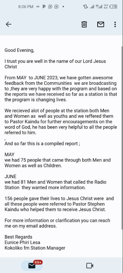 The first paragraph says it all–the IPICM radio broadcast “is changing lives.” It is worth noting that no one encouraged the respondents to call the station. They did that on their own. We are just so grateful the station forwarded their information to our partner, Pastor Stephen Kaindu.