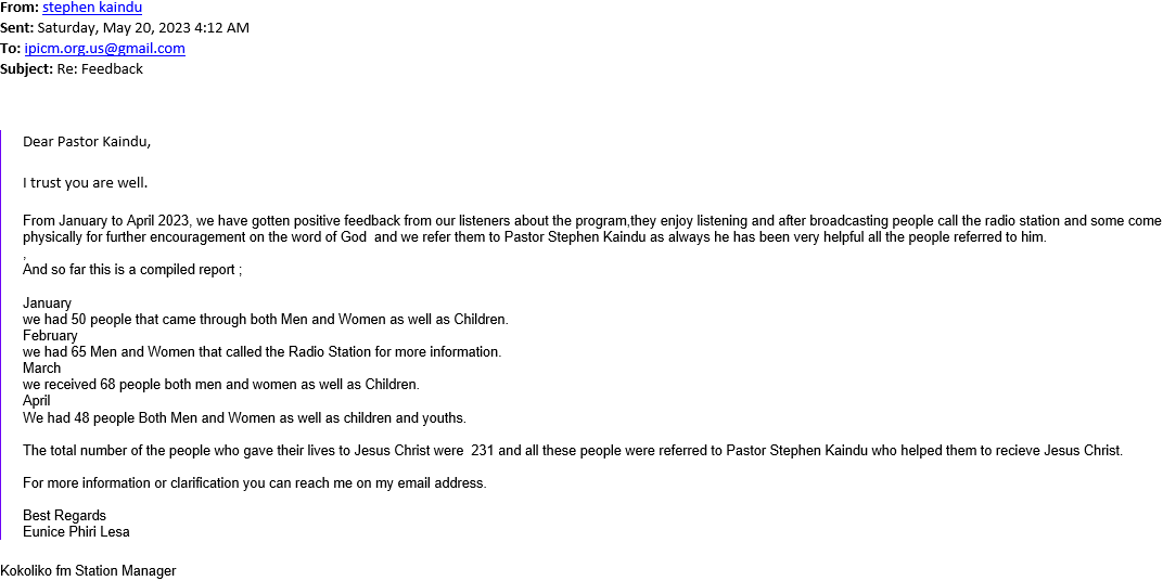 The first paragraph says it all–the IPICM radio broadcast “is changing lives.” It is worth noting that no one encouraged the respondents to call the station. They did that on their own. We are just so grateful the station forwarded their information to our partner, Pastor Stephen Kaindu.