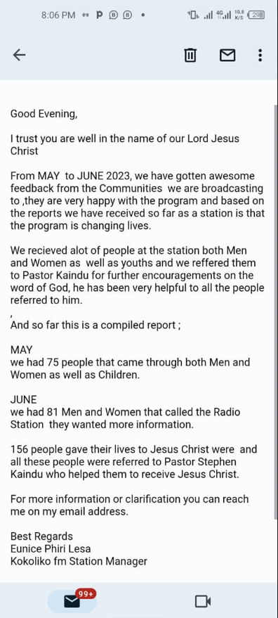 We recently received a report from one of our Zambian radio stations that broadcasts “Time in the Word” over weekends. Our goal is to train our listeners in the many facets of the Christian life as they grow in the mature things of faith. While teaching is one of our primary goals, God is doing much more than what we had planned for.