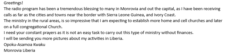 We are strongly encouraged by a new report originating from Monrovia, Liberia. It seems that not only the nation of Liberia is benefiting from IPICM’s radio broadcasts, but so are surrounding nations. We are particularly encouraged by the fact that people living in the “bush” are hearing the good news of Jesus Christ–many for the first time. Opoku Kwaku sent us the following email: